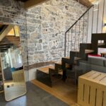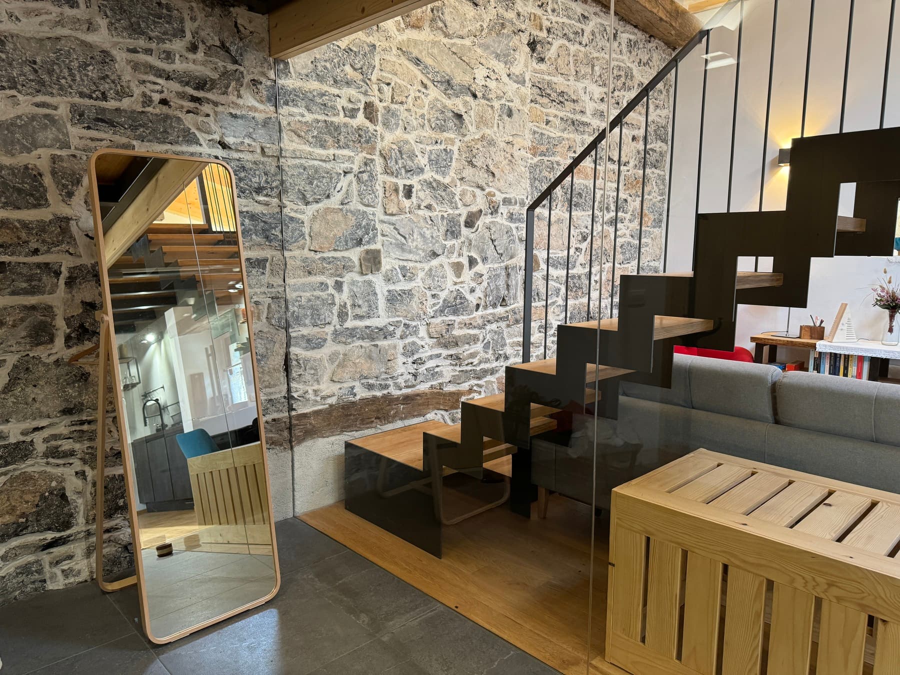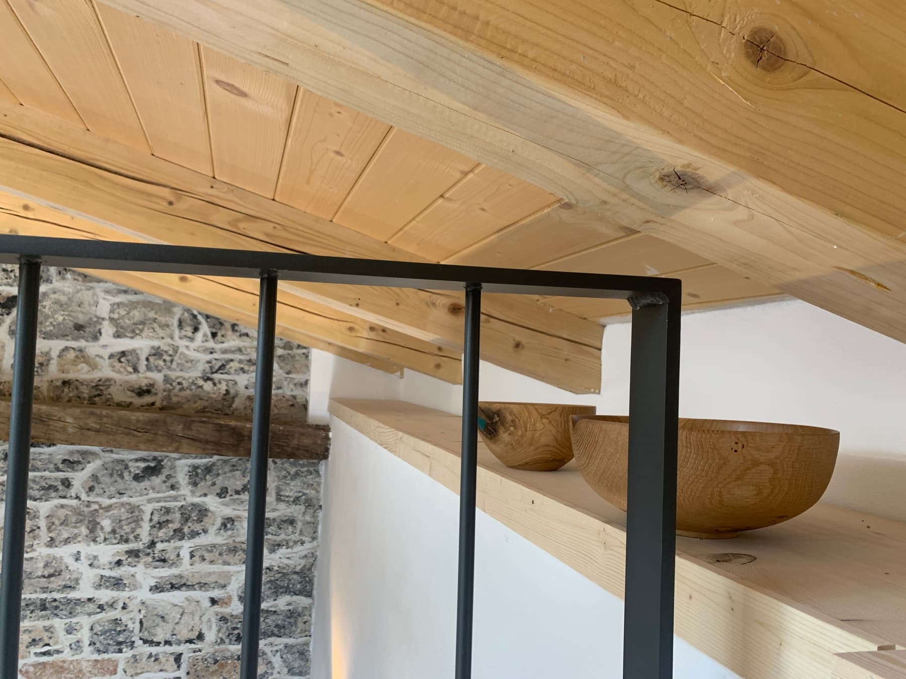 Spalno galerijo in dnevni prostor krasijo masivni hrastovi podi, medtem ko stari tramovi, odprto ostrešje in impresiven kamniti zid ustvarjajo harmonično celoto. Sodobni detajli, kot so kovinska konstrukcija stopnic in stekleni vetrolov, zagotavljajo udobje bivanja, tudi ko zapiha ostra kraška burja.
